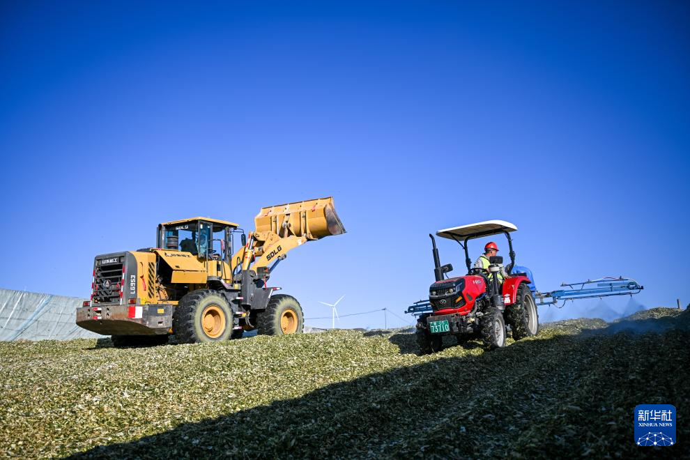 9月18日,在通遼市扎魯特旗巨日合鎮(zhèn),工程車輛壓實青貯玉米。新華社記者 連振 攝