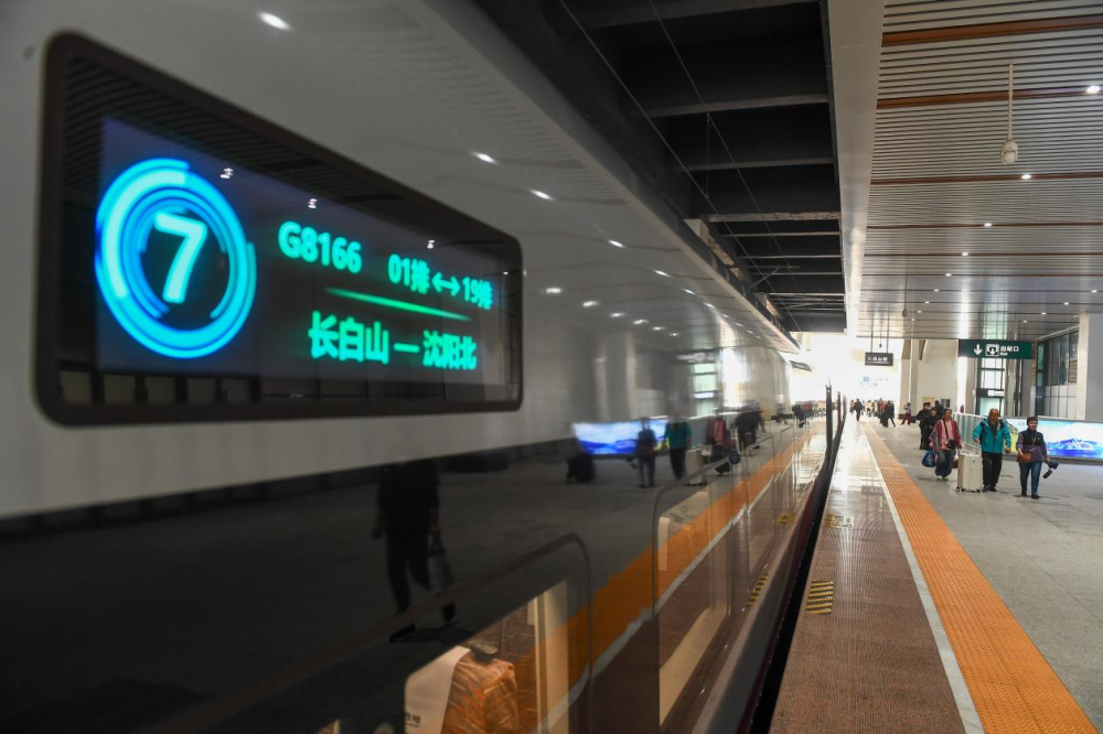 9月28日,旅客在長白山站陸續(xù)登上G8166次列車。(新華社記者 張楠 攝)